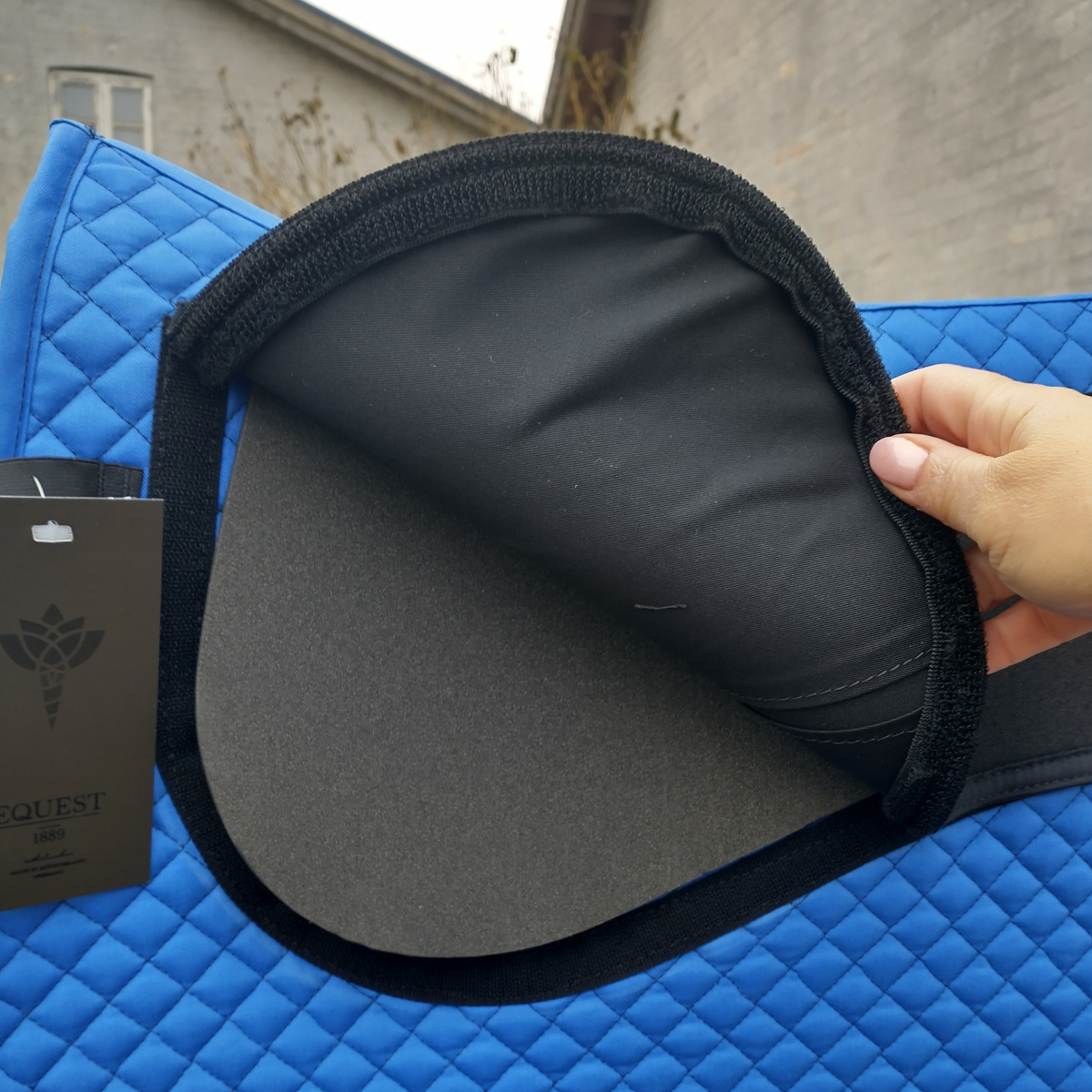 Meget lækkert og elegant trykfordelende korrektionsunderlag fra det tyske mærke Equest. Underlaget er lavet i slidstærk kvalitetsbomuld og lommerne til indlæg er i neopren. Neoprenen på oversiden er i sig selv trykfordelende og stødabsorberende, men sikrer også at sadlen ligger godt fast på underlaget og ikke glider. Der medfølger et indlæg på 0,5 cm samt korrektionsindlæg til løft foran eller bagved på 0,5 cm. Underlaget har korte stropper foran som passer bedre til Cozysadler samt andre sadelmærker med monoflap.